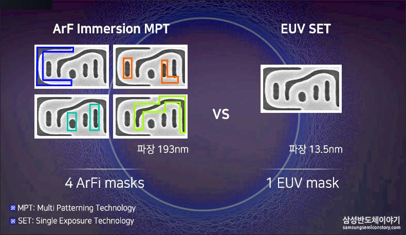 2019년 TSMC는 7nm 공정에서 EUV 리소그래피를 본격 양산에 적용하였고, 이를 기반으로 스마트폰 AP, AI 가속기, 서버용 CPU/GPU 등 고성능·저전력 칩 제품군이 출시되었습니다. 7nm 시대에는 193nm 침지(immersion) DUV에 의존하던 멀티 패터닝 공정(LELE, SADP 등) 일부를 EUV 단일 패턴으로 대체하여, 마스크 수·공정 단계·변동성을 줄이고 수율을 개선하는 효과가 있었습니다.