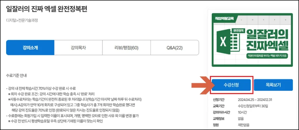 - 강좌 페이지에서는 교육 내용, 강사 정보, 수강 기간 등을 확인할 수 있습니다.